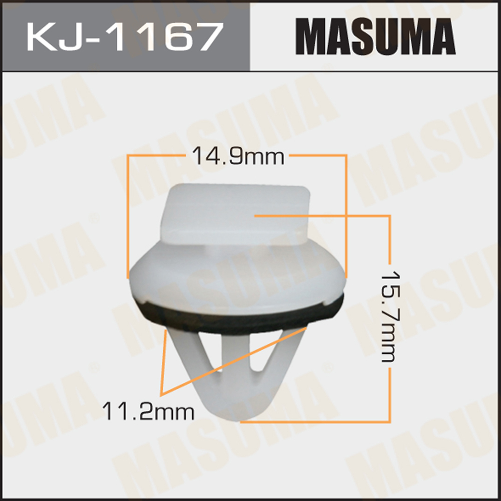 Клипса автомобильная MASUMA KJ-1167. Наименование клипсы: MASUMA, KJ1167. Masuma - один из крупнейших в мире производителей клипс для японских автомобилей. Автомобильная клипса (Клипса, зажим) - это пластмассовая деталь, предназначенная для крепежа облицовочной и изоляционной части автомобиля. В ассортименте бренда есть клипсы для крепления практически любого элемента отделки машины. Клипсы отличаются повышенной прочностью и износостойкостью.
