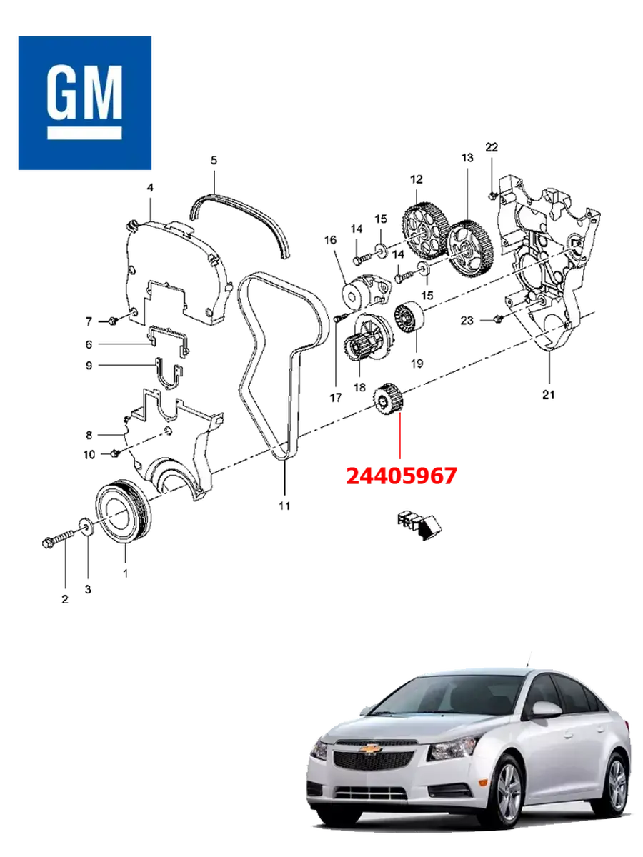 Шкив зубчатый, коленчатого вала, ремня ГРМ на автомобиль Chevrolet Cruze, произведенный в период с 2005 по 2012 год, в комплектации с 16-тикл апанным двигателем объемом 1,6 и 1,8л. Наименование детали: GM, 24405967. Номер по каталогу запасных частей GM: 24405967.